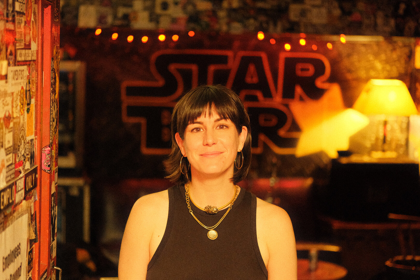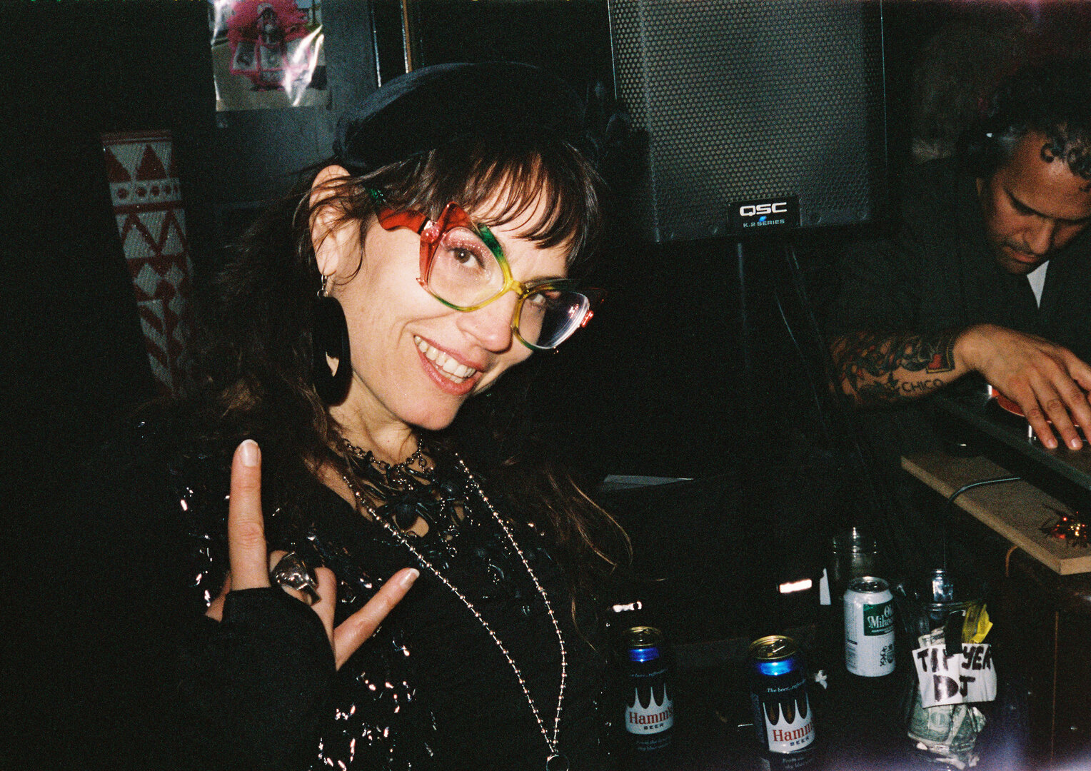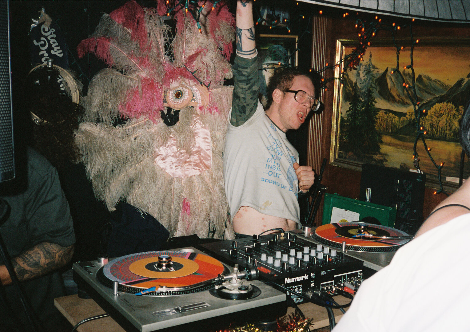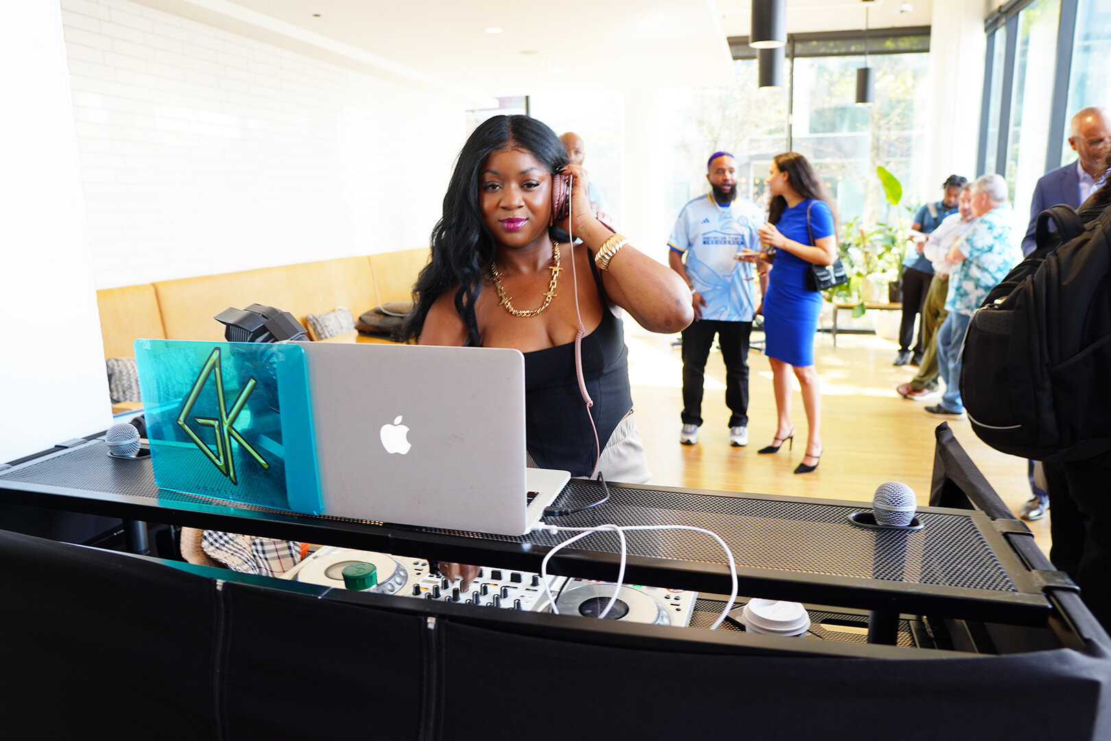 A female DJ wearing headphones performs behind a laptop and DJ controller in a bright indoor venue, with guests socializing in the background.