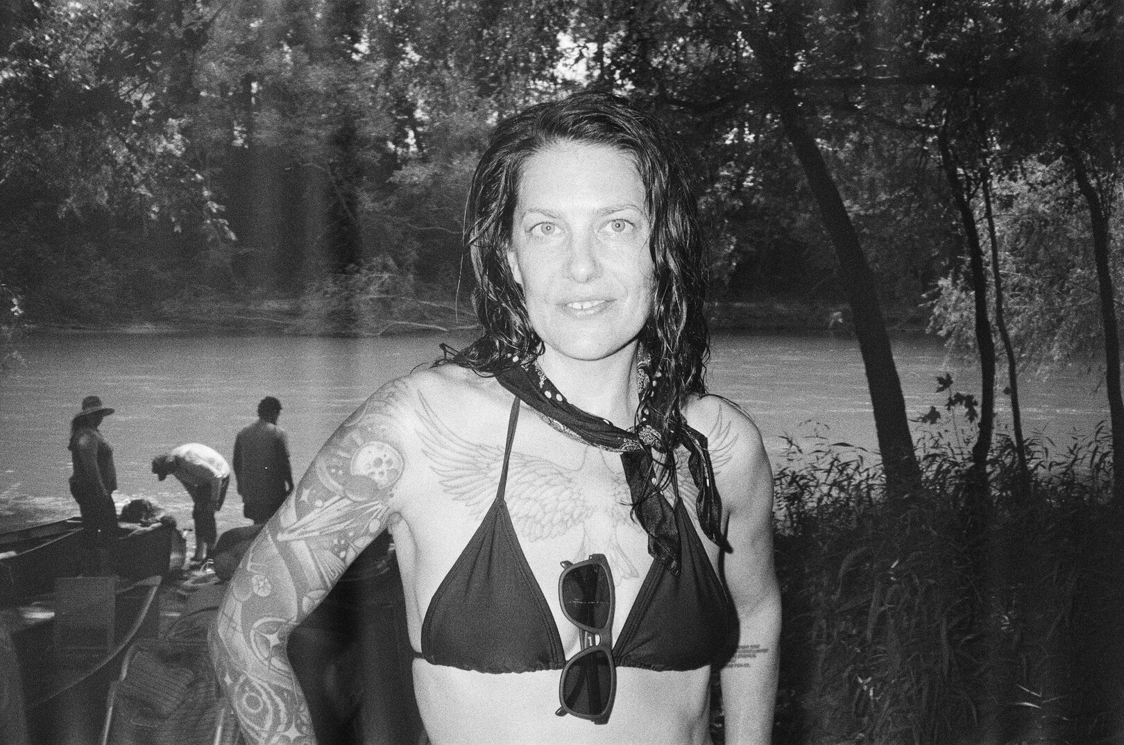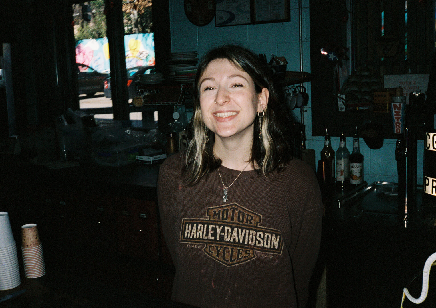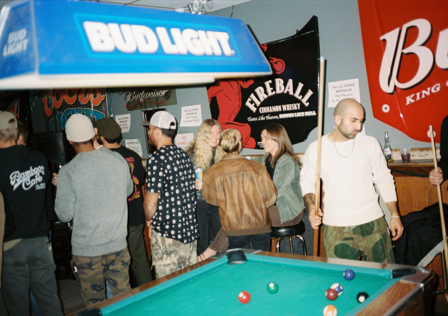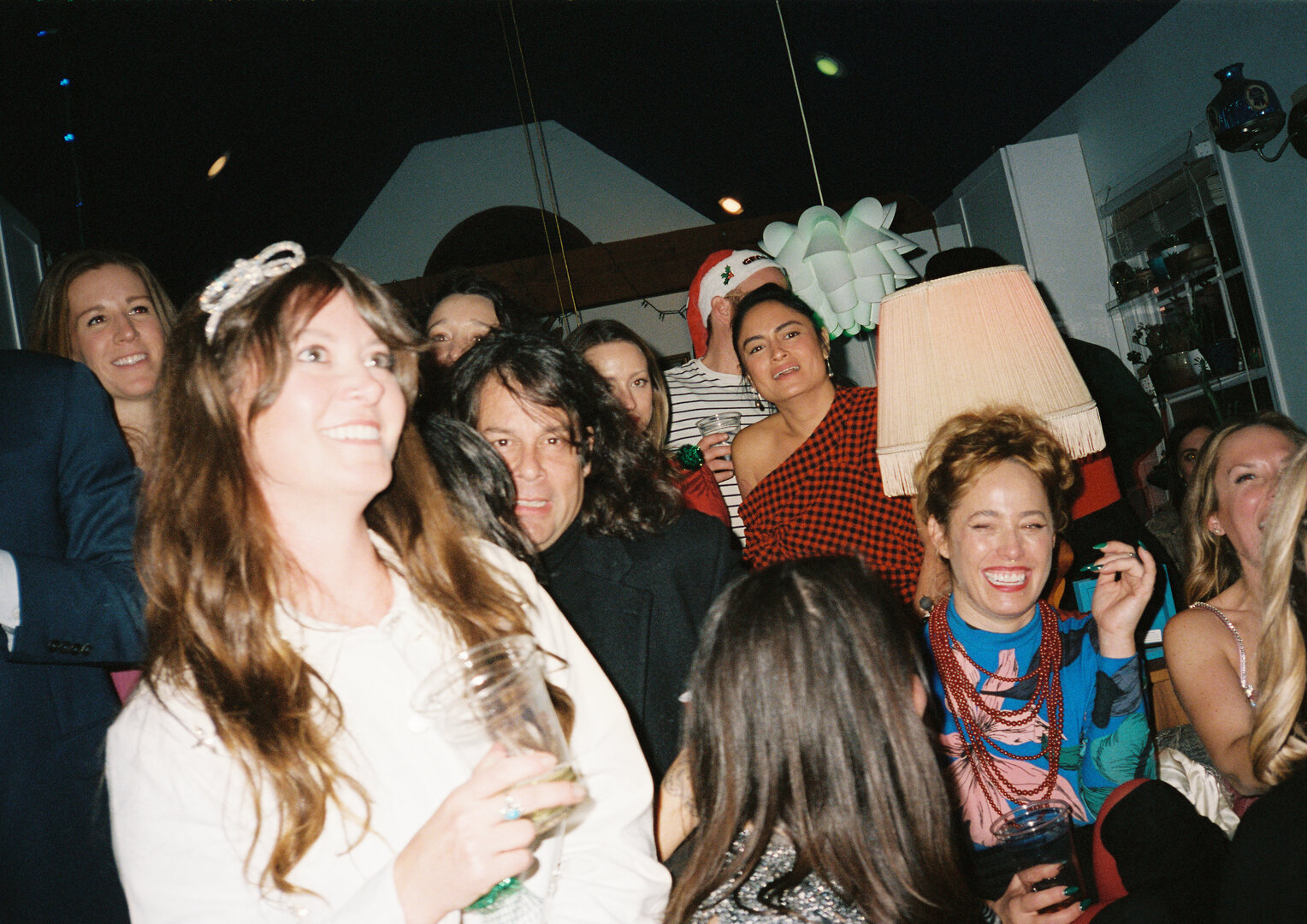 A female DJ wearing headphones performs behind a laptop and DJ controller in a bright indoor venue, with guests socializing in the background.