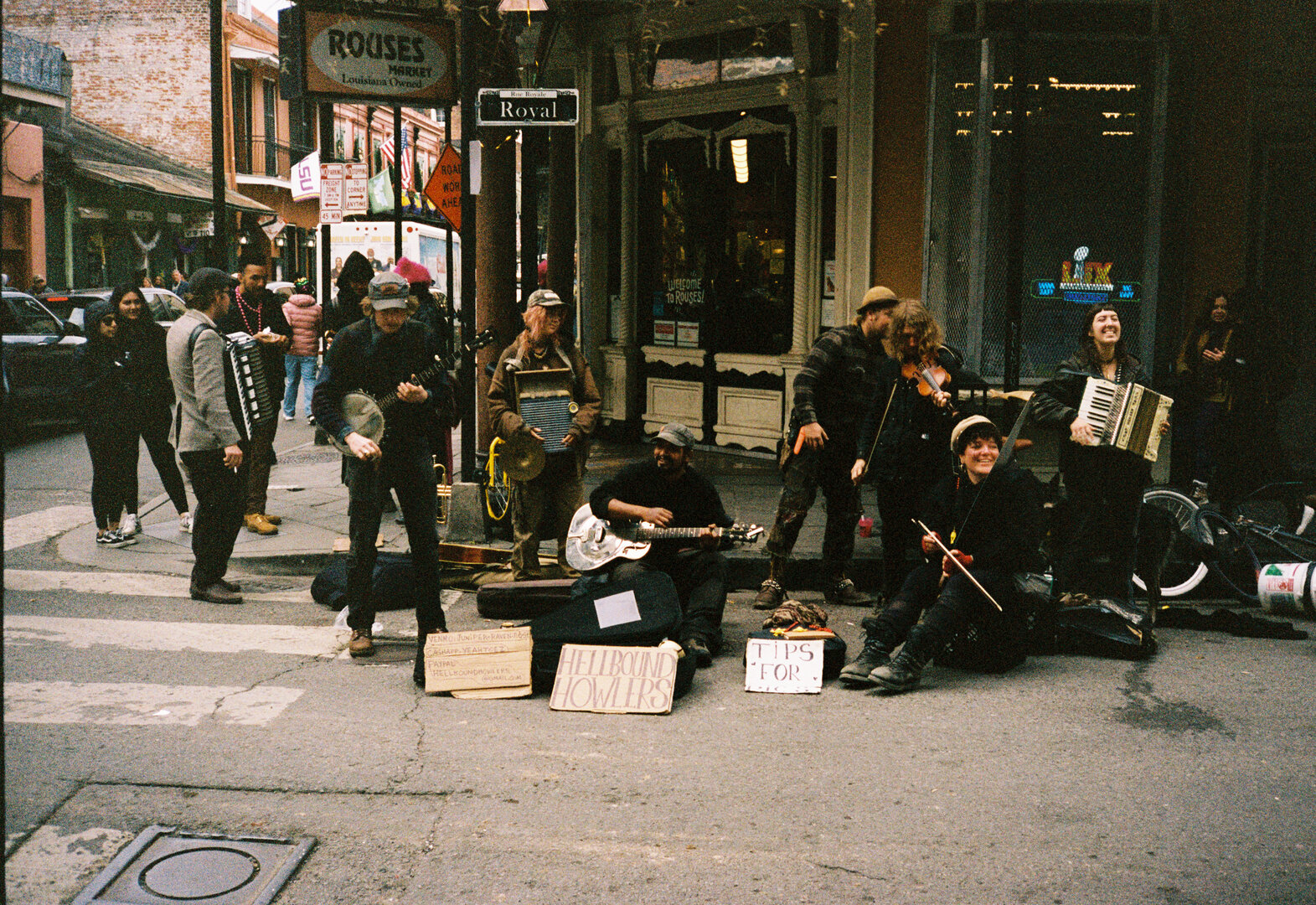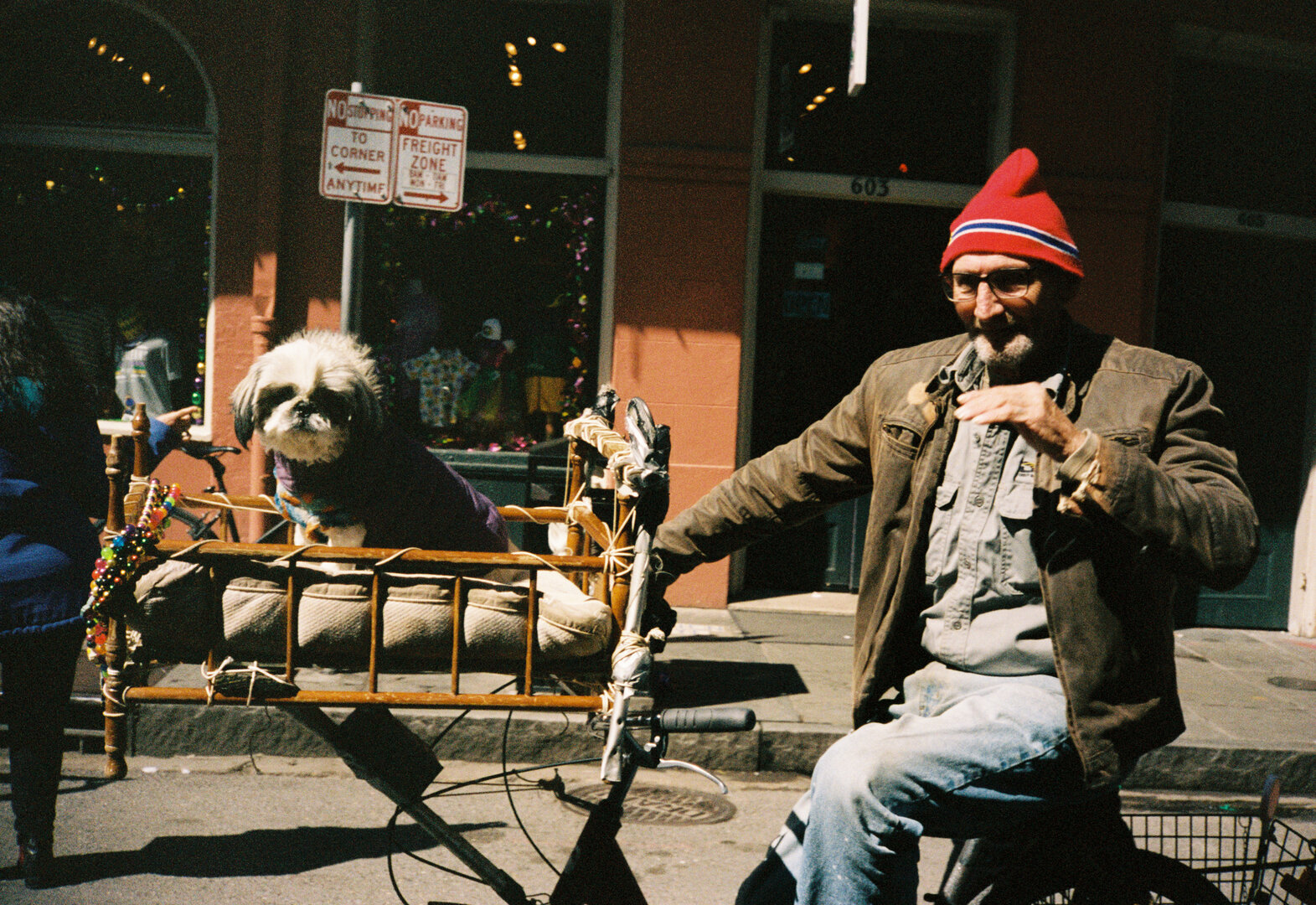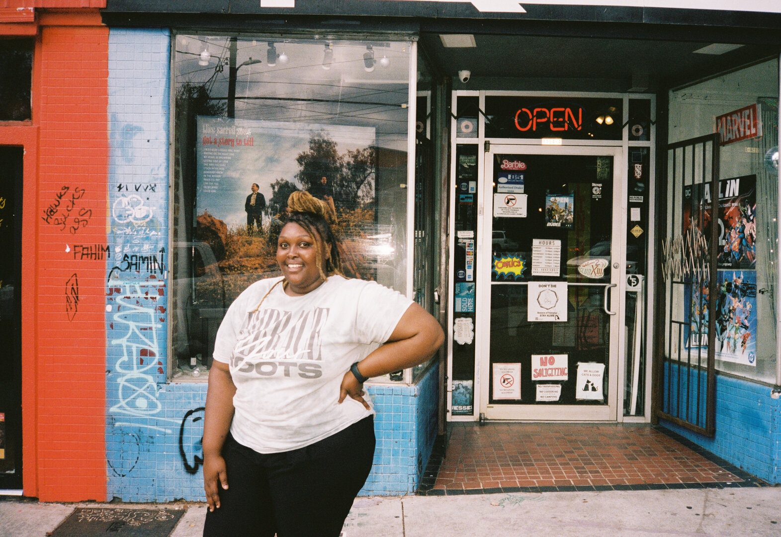 Two people posing on a sunny city sidewalk, smiling and making hand gestures toward the camera; one wears a black jacket and cap, while the other stands behind in a hoodie and sideways cap, with buildings and passing cars in the background.
