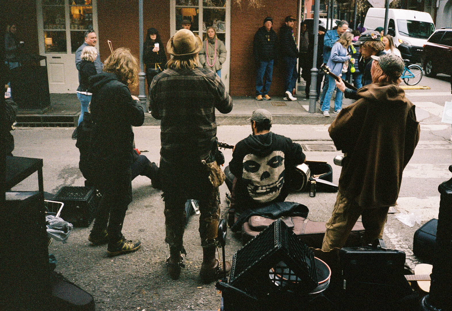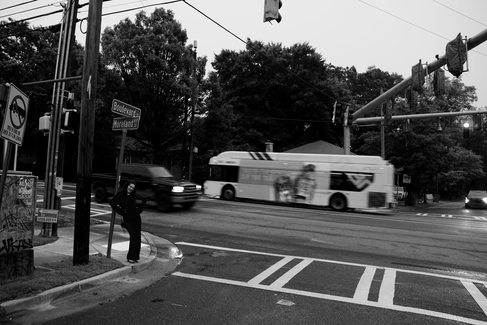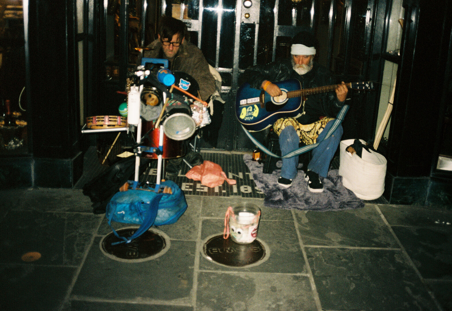 Two people posing on a sunny city sidewalk, smiling and making hand gestures toward the camera; one wears a black jacket and cap, while the other stands behind in a hoodie and sideways cap, with buildings and passing cars in the background.